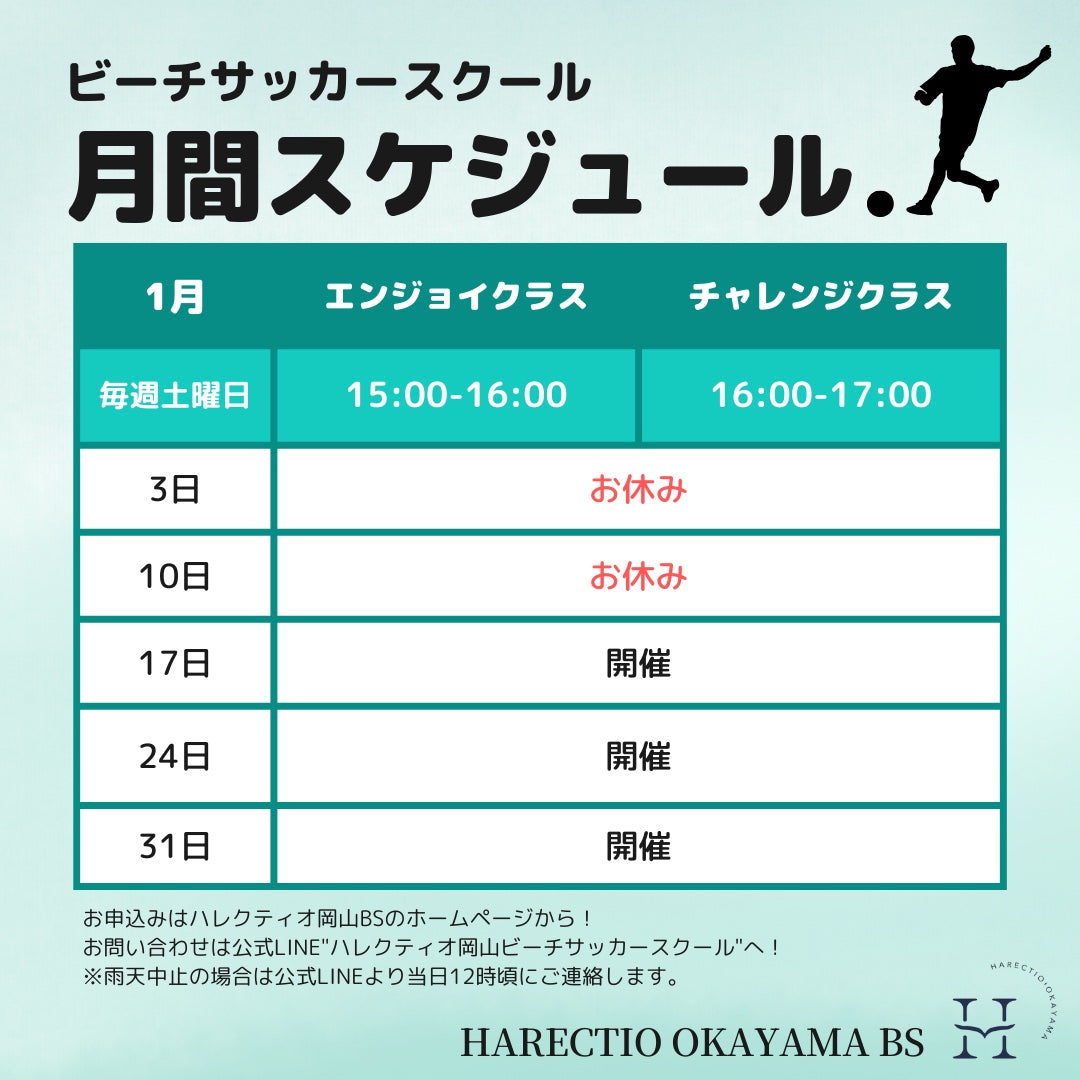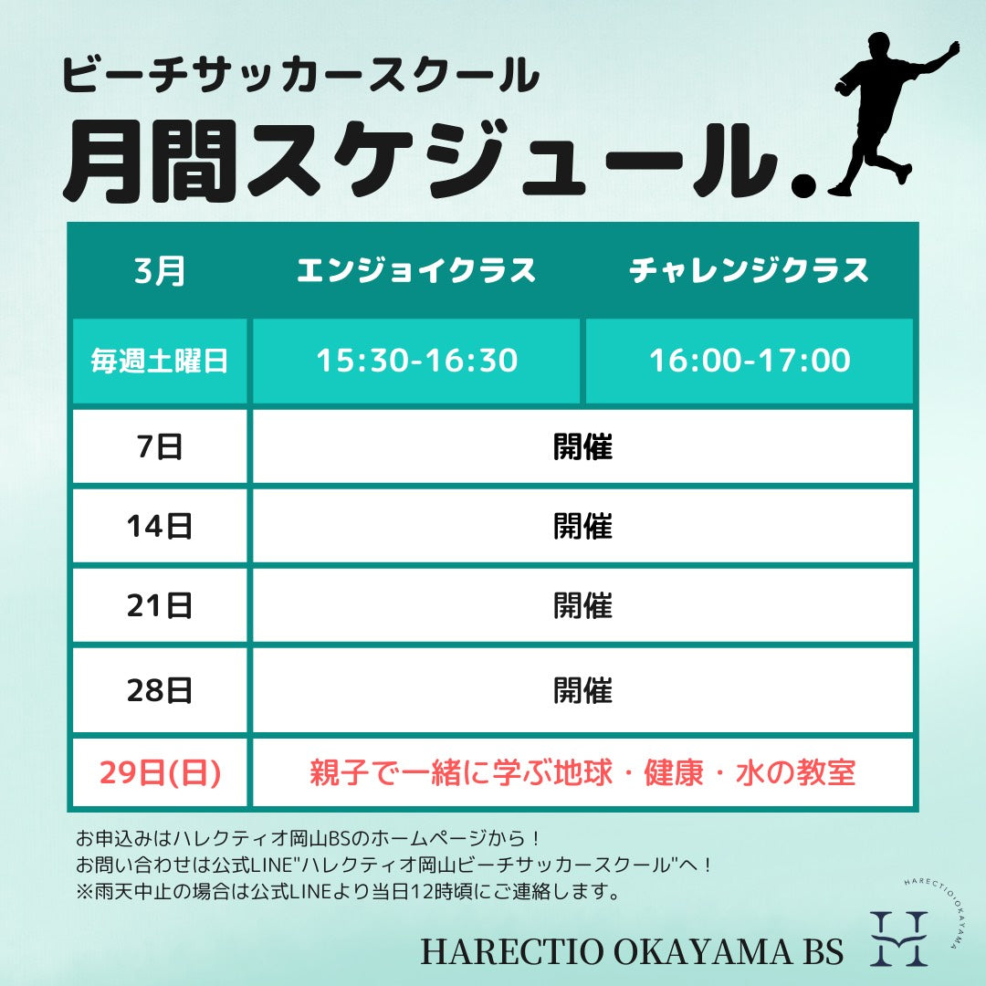 砂 浜 で 運 動 す る 楽 し さ 、 ボ ー ル を 蹴 る 面 白 さ を 感 じ て も ら い 、 そ の 中 で バ ラ ン ス 感 覚 や ボ デ ィ コ ン ト ロ ー ル な ど の 運 動 神 経 を 向 上 さ せ る 目 的 で 、 練 習 の 中 に 遊 び を 入 れ て 砂 浜 を 走 っ た り 、 ボ ー ル を 蹴 っ た り し て 、 無 意 識 に 普 段 使 わ な い 筋 肉 を 使 う 事 を ハ レ ク テ ィ オ の 選 手 達 で 、 指 導 や サ ポ ー ト の も と ビ ー チ サ ッ カ ー を 通 じ て 行 っ て い ま す 。